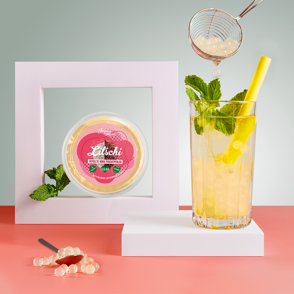 Fügen Sie Getränken und anderen kulinarischen Kreationen unsere Litschi Fruchtperlen, auch bekannt als Popping Boba, hinzu! Sie sind verzehrfertig und wurden für Bubbletees entwickelt, schmecken aber auch in Desserts, Cocktails und vielem mehr.