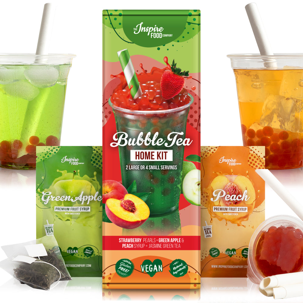 ✅ Premium Ingredients: Includes 100g Strawberry Boba, 30ml Green Apple Syrup, and 30ml Peach Syrup for a sweet and tangy flavor combo.