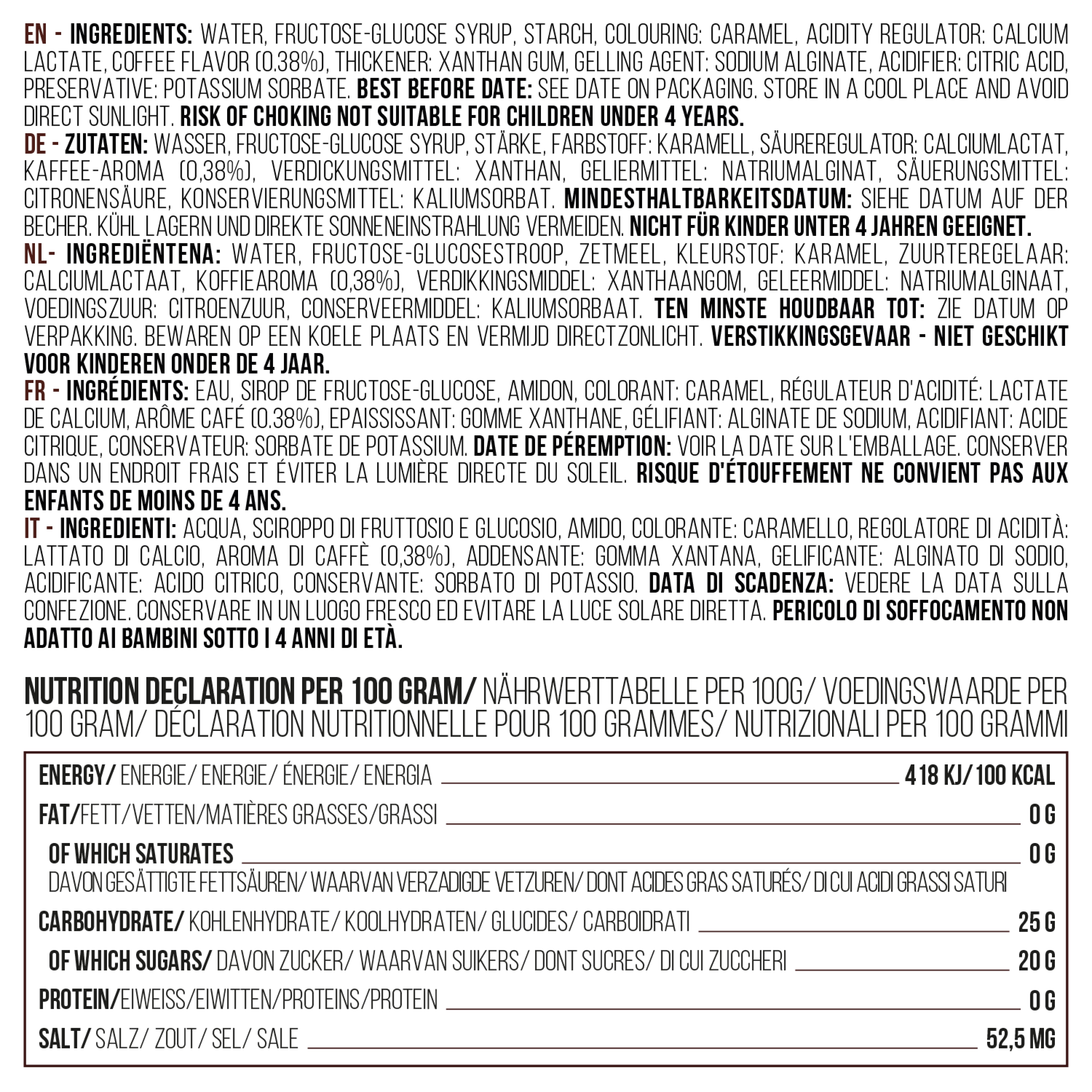 Ingrediënten: Water, fructose, zetmeel, kleurstof: gewone karamel, zuurteregelaar: calciumlactaat, koffie-aroma, verdikkingsmiddel: xanthaangom, zuurteregelaar: citroenzuur; geleermiddel: natriumalginaat, conserveermiddel: kaliumsorbaat.