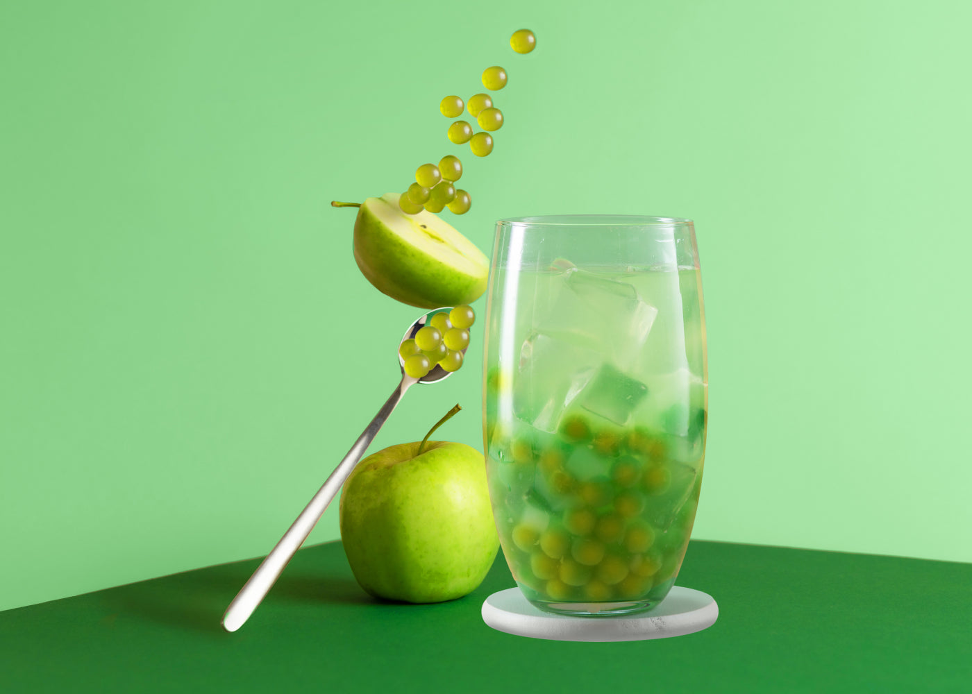 Add green apple bursting fruit pearls - commonly known as boba - to your drinks and other creations! These ready-to-eat treats are designed for bubble teas, but also are delicious in desserts, cocktails, and more.